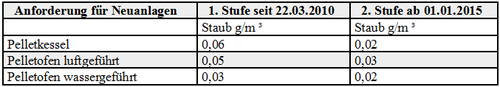 Für Anlagen mit mehr als 15 Kilowatt (kW) Nennwärmeleistung wurde ein Grenzwert von 0,15 Gramm Feinstaub pro Kubikmeter (g/m³) festgelegt. Außerdem bestehen Grenzwerte für die Emissionen an Kohlenmonoxid. Diese Werte werden allerdings nur bei mechanisch beschickten Heizkesseln – in der Regel Pelletkesseln – jährlich und bei handbeschickten Holzfeuerungsanlagen einmalig nach der Inbetriebnahme überwacht.