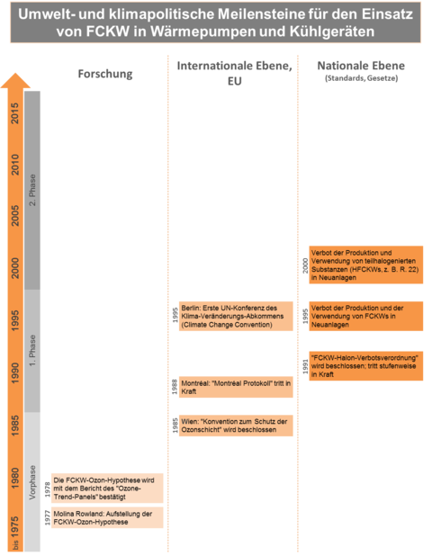 Auf nationaler Ebene wurde bereits 1991 eine "FCKW-Halon-Verbotsverordnung" beschlossen, die stufenweise in Kraft trat. 1995 folgte ein Verbot der Produktion und der Verwendung von FCKWs in Neuanlagen. Das Verbot erstreckte sich ab 2000 auf die Produktion und Verwendung von teilhalogenierten Substanzen (HFCKWs, z. B. R 22) in Neuanlagen. 2006 löste die Chemikalien-Ozonschichtverordnung (Verordnung über Stoffe, die die Ozonschicht schädigen) die FCKW-Halon-Verbotsverordnung ab. Zudem trat 2008 die Chemikalien-Klimaschutzverordnung (Verordnung zum Schutz des Klimas vor Veränderungen durch den Eintrag bestimmter fluorierter Treibhausgase), zur Verminderung der Emission fluorierter Kältemittel aus Kälteanlagen, in Kraft.