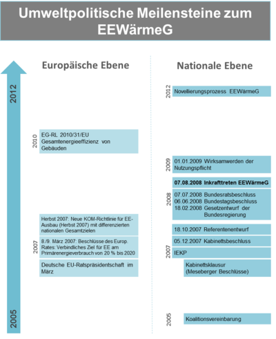 Die parlamentarischen Gremien diskutierten ab 2010 über die Novelle des EEWärmeG zur Umsetzung der EU-Richtlinie zur Förderung der Nutzung von Energie aus erneuerbaren Quellen.[3] Mit dem EAG-EE 2010 (Europarechtsanpassungsgesetz) wurde die EU-Erneuerbare-Energien-Richtlinie[4] in nationales Recht umgesetzt. Das EAG-EE führte im April 2011 schließlich u. a. zur Änderung des EEWärmeG. Das EEWärmeG wurde am 24. Februar 2011 beschlossen und trat zum 1. Mai 2011 in Kraft.
