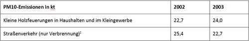 Feinstaubreduktionen mittels emissionsärmerer Formen der Holzverbrennung wurden im Zeitraum 2000 bis 2005 durch eine Zunahme der Holzverfeuerungsanlagen zunichtegemacht. Die Emissionen an gesundheitsschädlichem Feinstaub aus Holzfeuerungsanlagen in Haushalten und im Kleingewerbe waren 2006 insgesamt etwa so hoch wie die aus den Motoren der Pkw, Lkw und Motorräder. Ca. 24.000 Tonnen Feinstaub stammten 2006 allein aus Holzfeuerung (vgl. Tabelle 1).